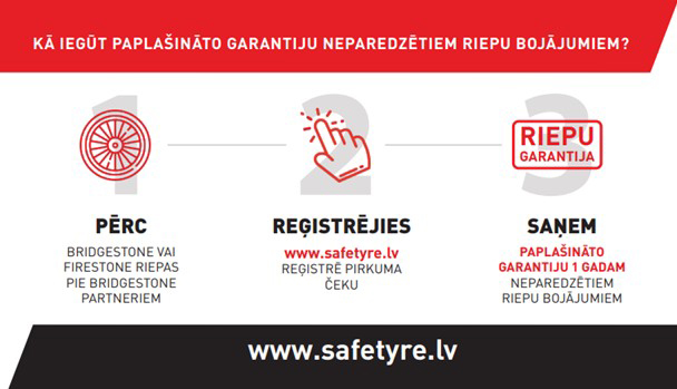 Iegādājies Bridgestone vai Firestone riepu komplektu un saņem gada garantiju neparedzētiem riepu bojājumiem.
